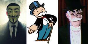 Máscaras de Guy Fawkes, utilizada na HQ “V for Vendetta” e adotada pelo Anonymous, e do Rich Uncle Pennybags, mascote do jogo Monopoly